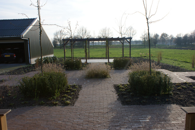 Tuinaanleg, bestrating, tuinhuisje, pergola, beplanting
